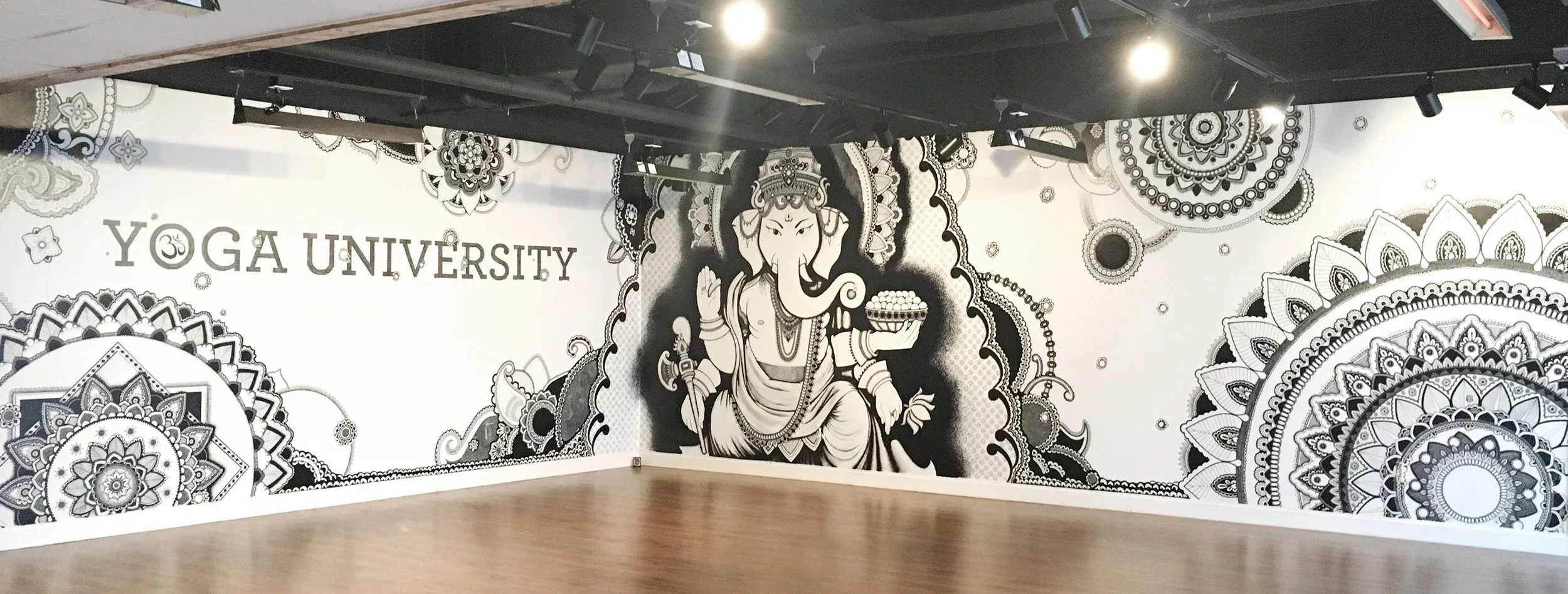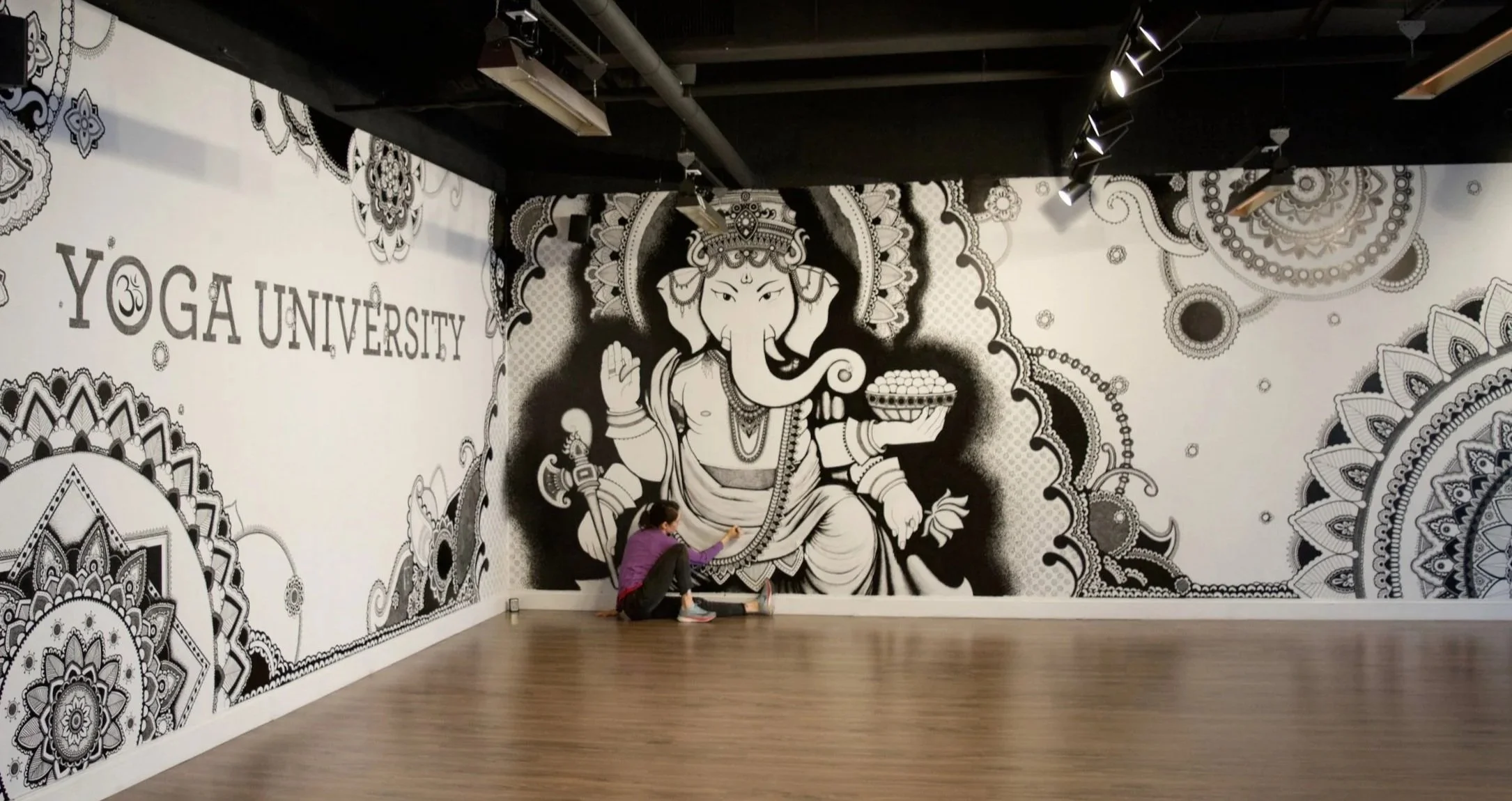 The mural spans 60 ft. It was hand-drawn with oil-based Sharpies. Ganesh is the focal point, surrounded by mandalas and a hand-painted logo.