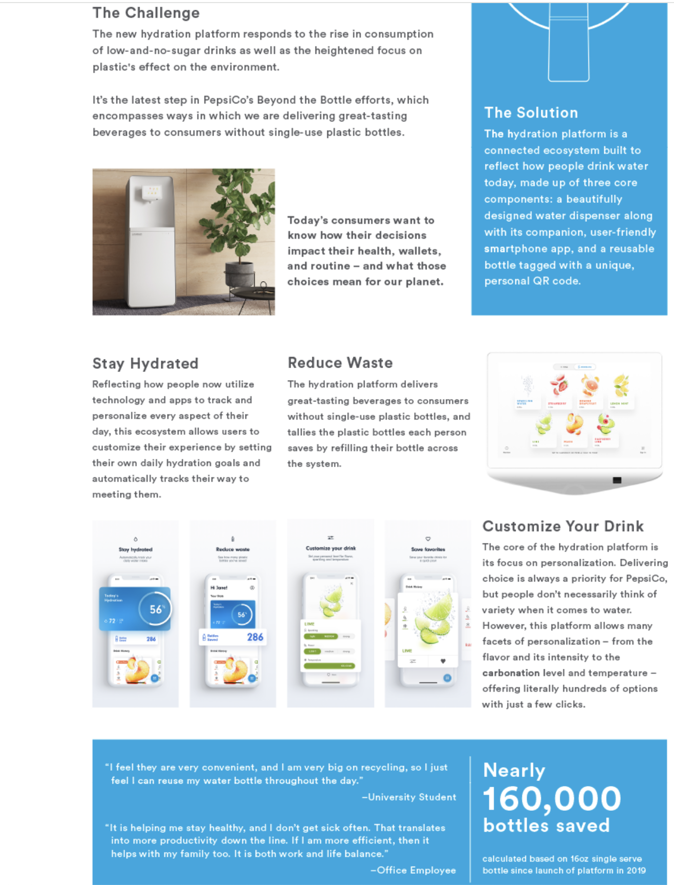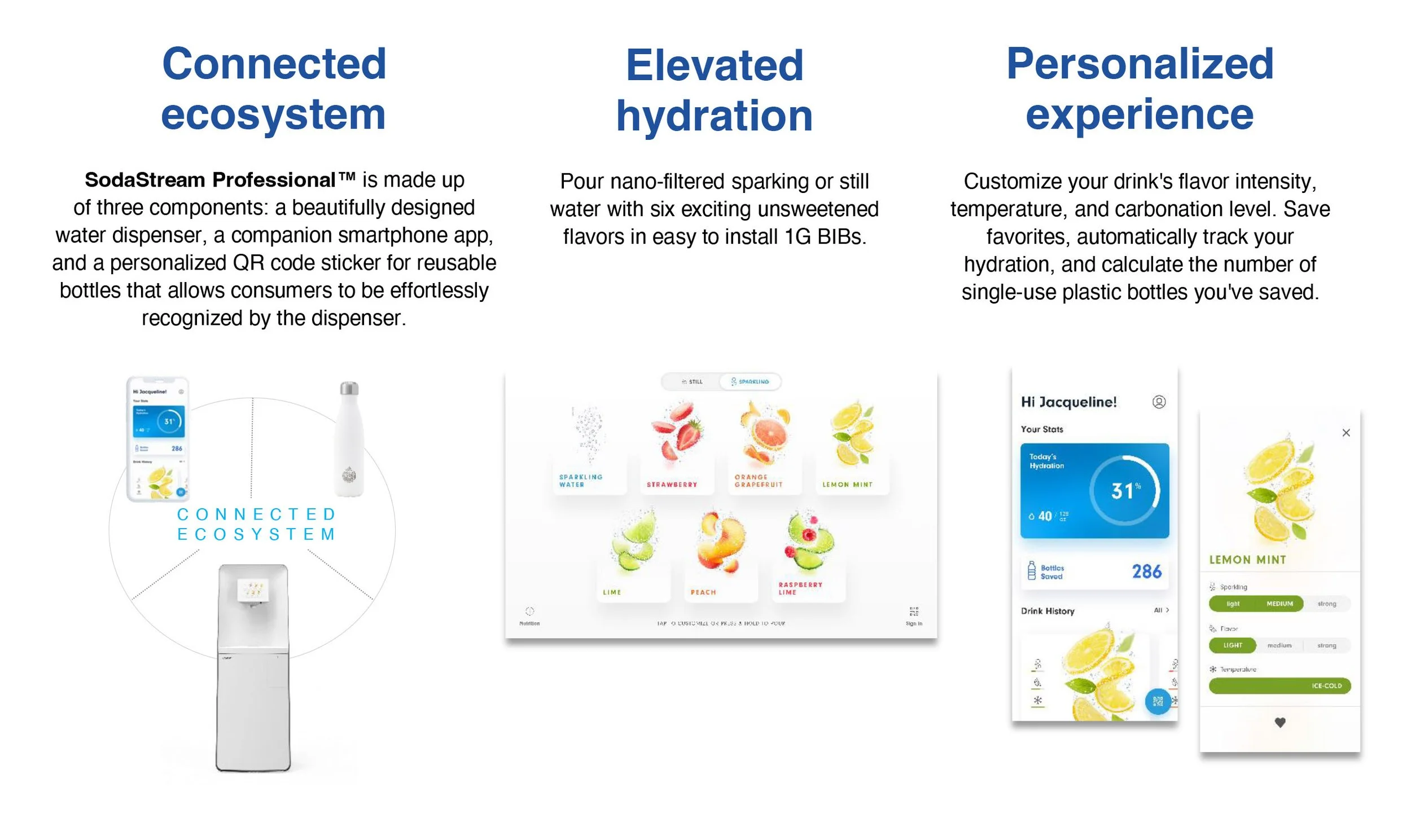 Sodastream Professional is a hydration platform that is a connected, sustainable water dispenser system developed for workplaces, campuses, and airports, allowing users to customize and track their water intake. It supports sustainability goals by encouraging the use of reusable bottles to reduce plastic waste.
